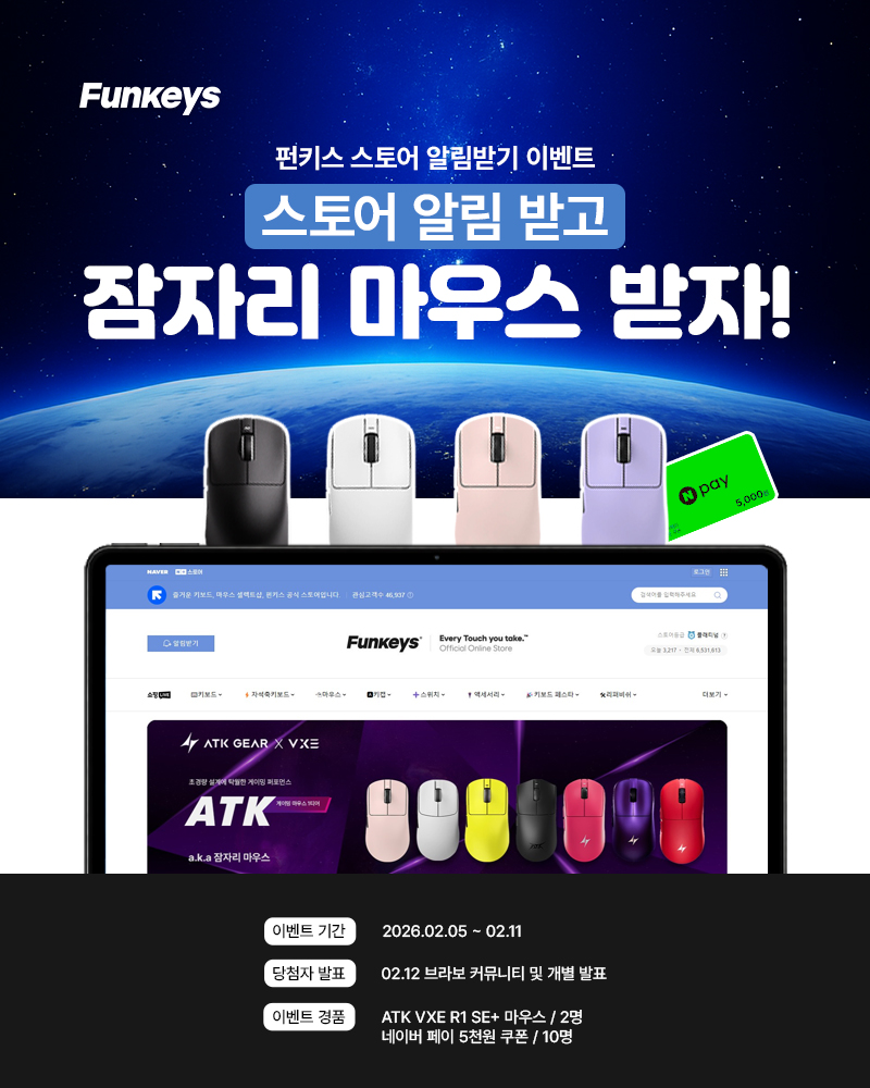 안녕하세요 브라보텍의 프리미엄 키보드/마우스 및 액세서리 브랜드 펀키스입니다. 2026년 2월 5일부터 11일까지 진행했던 펀키스 스토어 알림 받고 잠자리 마우스 받자! 이벤트 당첨자를 발표합니다. 정상 참여 고객 중 랜덤 추첨을 통해 아래와 같이 당첨되었습니다.
