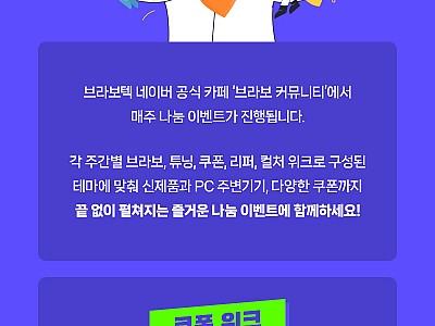 안녕하세요. 브라보텍입니다.브라보텍 네이버 공식 카페 '브라보 커뮤니티'에서 진행되는 2월 3주차 나눔 이벤트 품목을 안내 드립니다.각 주간별 브라보, 튜닝, 쿠폰, 리퍼, 컬쳐 …