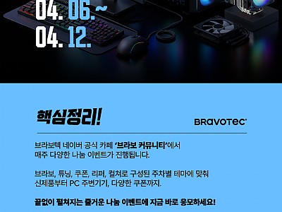 안녕하세요. 브라보텍입니다.4월에도 다양한 신제품 출시/특가/이벤트를 진행하고 있습니다.현재 진행 중인 이벤트에 대한 자세한 내용은 브라보텍 공식 커뮤니티 네이버 카페에서 확인하…