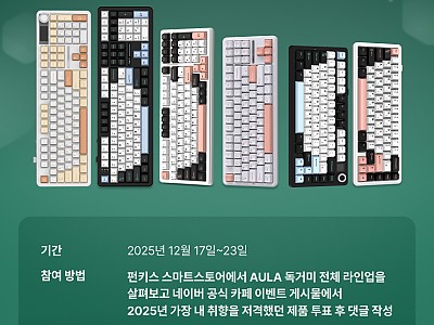 안녕하세요 브라보텍의 프리미엄 키보드/마우스 및 액세서리 브랜드 펀키스입니다. 2025년 12월 17일부터 23일까지 진행했던 AULA x 브라보 커뮤니티 12월 이벤트 ‘2025…