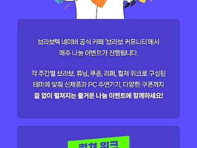 안녕하세요. 브라보텍입니다.브라보텍 네이버 공식 카페 '브라보 커뮤니티'에서 진행되는 1월 5주차 나눔 이벤트 품목을 안내 드립니다.각 주간별 브라보, 튜닝, 쿠폰, 리퍼, 컬쳐 …