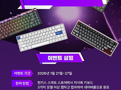 펀키스, 자석축 키보드 시리즈 1월 이벤트 안내드립니다.2026년 1월 21일부터 27일까지 펀키스, 자석축 키보드 시리즈 1월 이벤트 ‘펀키스와 함께라면 나도 방구석 프로게이머!…