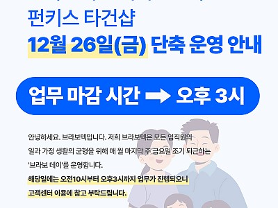 브라보텍 고객지원센터/펀키스 타건카페 12월 26일(금) 단축 운영 안내