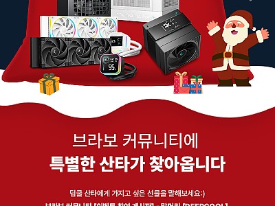 안녕하세요. 브라보텍입니다.12월은 크리스마스와 연말이 함께하는 특별한 달입니다.이를 맞아 브라보텍은 연말 시즌을 기념하여 브라보 커뮤니티 회원을 대상으로 DEEPCOOL 제품 증…