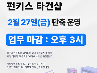 브라보텍/펀키스 2026년 설 연휴 업무 및 휴무 일정 안내 드립니다.- 택배 발송 마감 : 2026년 2월 13일(금) 오전 11:00 마감- 브라보텍 고객센터/펀키스 타건카페 …