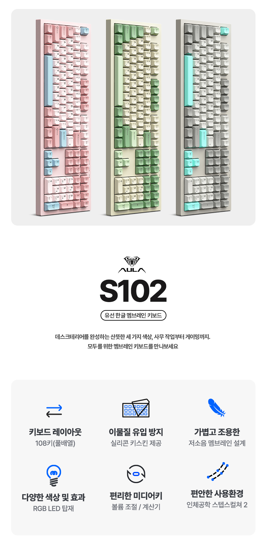 AULA 멤브레인 키보드 S102와 S102Pro는 다양한 환경에서 두루 사용할 수 있는 풀배열 레이아웃이 적용되어 있어 키보드 사용시 별도 적응이 필요하지 않으며, 업무 환경과 게이밍 모두 사용할 수 있는 극강의 가성비로 완성된 제품으로 데스크테리어 환경에 포인트를 더해줄 수 있는 산뜻한 핑크, 그린, 그레이 세 가지 색상으로 구성되었습니다.