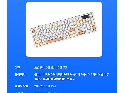 펀키스, AULA 10월 이벤트 독거미 F시리즈 ‘이 키보드 들고 기다리고 있겠습니다’ 안내드립니다.2025년 10월 1일부터 7일까지 펀키스, AULA 10월 이벤트 독거미 F시…