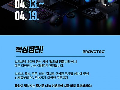 안녕하세요. 브라보텍입니다.4월에도 다양한 신제품 출시/특가/이벤트를 진행하고 있습니다.현재 진행 중인 이벤트에 대한 자세한 내용은 브라보텍 공식 커뮤니티 네이버 카페에서 확인하…