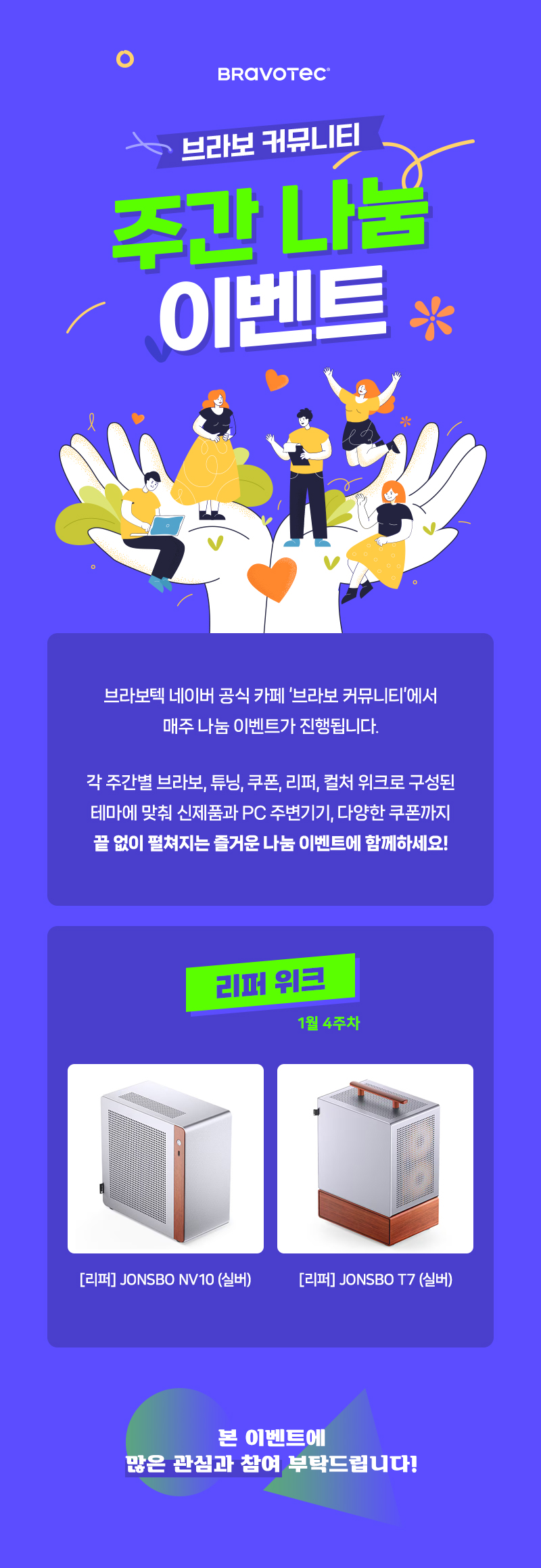 브라보텍 네이버 공식 카페 '브라보 커뮤니티'에서 진행되는 1월 4주차 나눔 이벤트 품목을 안내 드립니다.