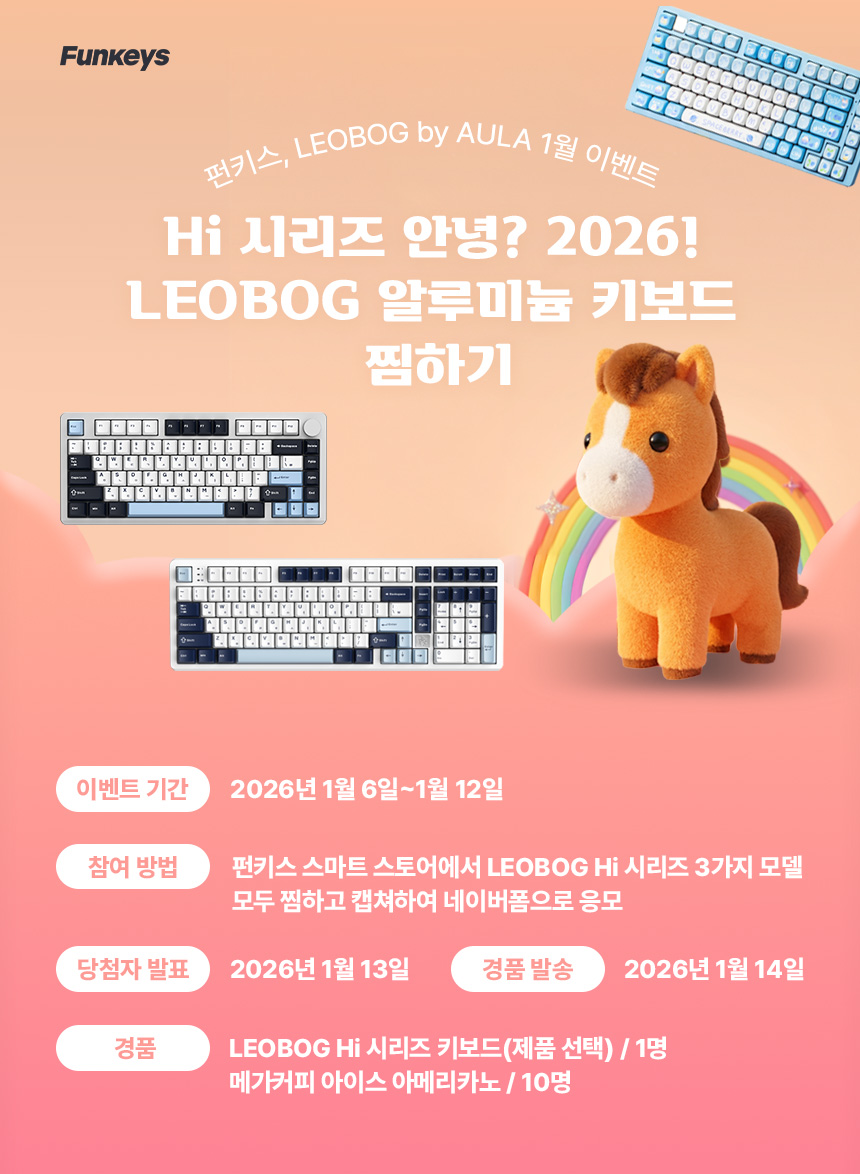 2026년 1월 6일부터 12일까지 펀키스, LEOBOG by AULA 1월 이벤트 Hi 시리즈 ‘안녕? 2026! LEOBOG 알루미늄 키보드 찜하기’ 가 진행됩니다.