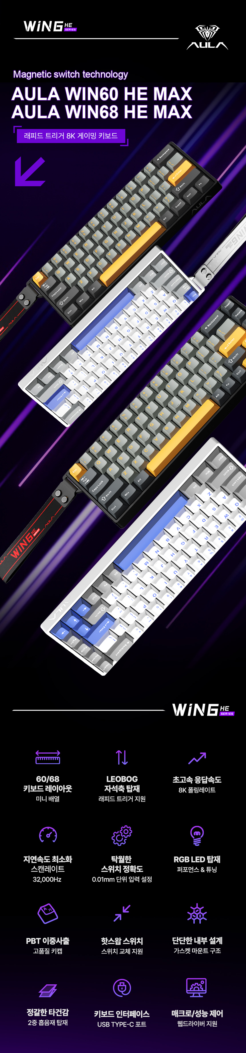 AULA Win60/68HE Max 모델은 컴팩트한 60/68키 미니 배열에 8K 폴링레이트와 래피드 트리거 지원 LEOBOG 스피릿퍼플축 자석축으로 구성되었으며, 32,000Hz의 스캔레이트와 0.01mm 단위 입력 지원으로 지연 없는 빠른 반응속도를 갖춘 제품입니다. 골든 블랙과 라벤더 화이트 두 가지 색상으로 출시되어 데스크테리어에 따라 선택할 수 있으며, 기본 제공되는 스트랩으로 멋스러운 연출과 편리한 휴대가 가능합니다.