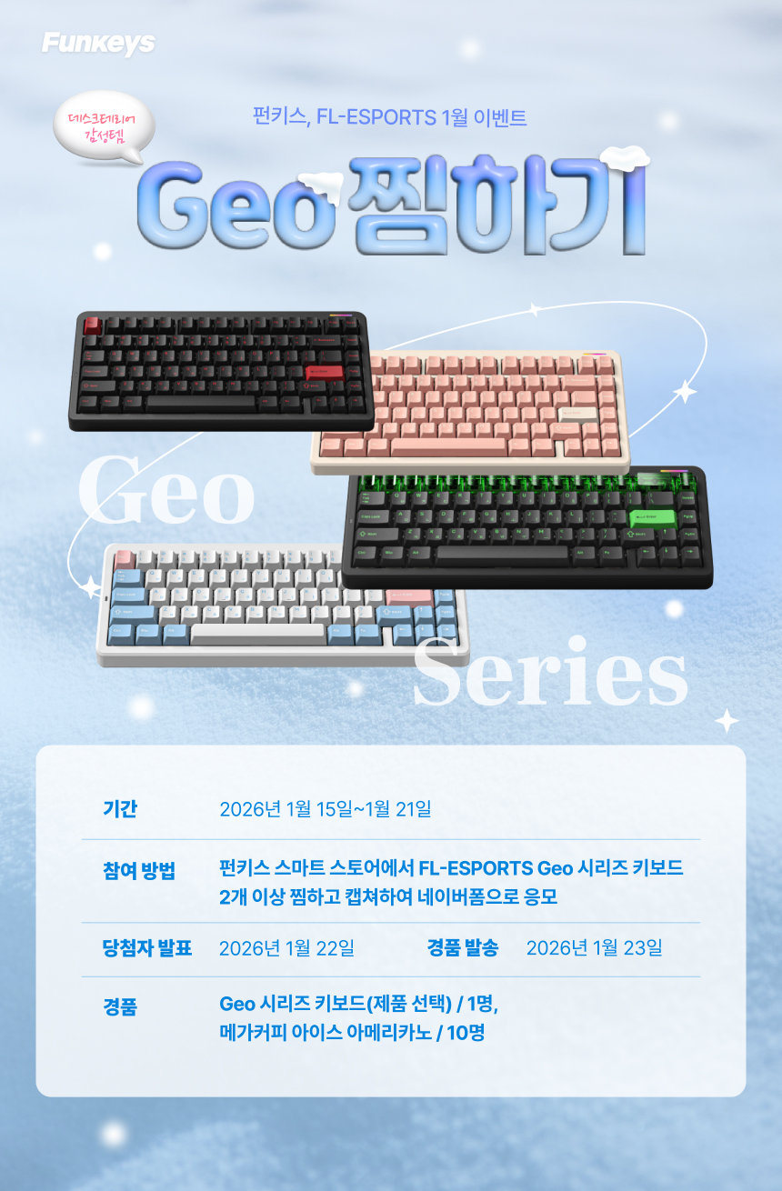 2026년 1월 15일부터 21일까지 펀키스, FL-ESPORTS 1월 이벤트 Geo 시리즈 ‘데스크테리어 감성템, Geo 찜하기’ 가 진행됩니다.