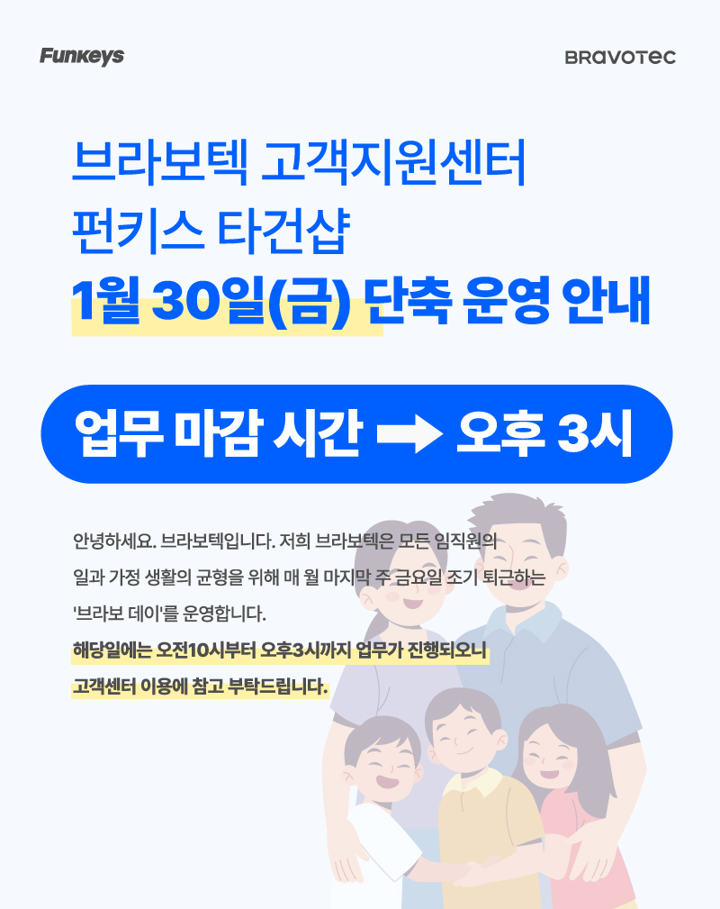 브라보텍 고객지원센터/펀키스 타건카페 1월 30일(금) 단축 운영 안내 브라보텍 공지 0 2 2시간전 안녕하세요. 브라보텍입니다.저희 브라보텍은 모든 임직원의 일과 가정 생활의 균형을 위해 매 월 마지막 주 금요일 조기 퇴근하는 '브라보 데이'를 운영합니다.해당일에는 오전 10시부터 오후 3시까지 업무가 진행되오니 고객센터 이용에 참고 부탁드립니다. 감사합니다.-2026년 1월 브라보데이 : 1월 30일(금)-업무 마감 시간 : 오후 3시