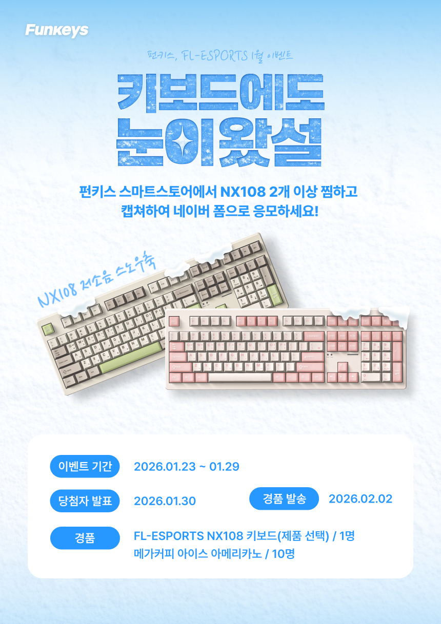 [당첨자 발표] 펀키스, FL-ESPORTS 1월 이벤트 ‘NX108 저소음 스노우축, 키보드에도 눈이 왔설’