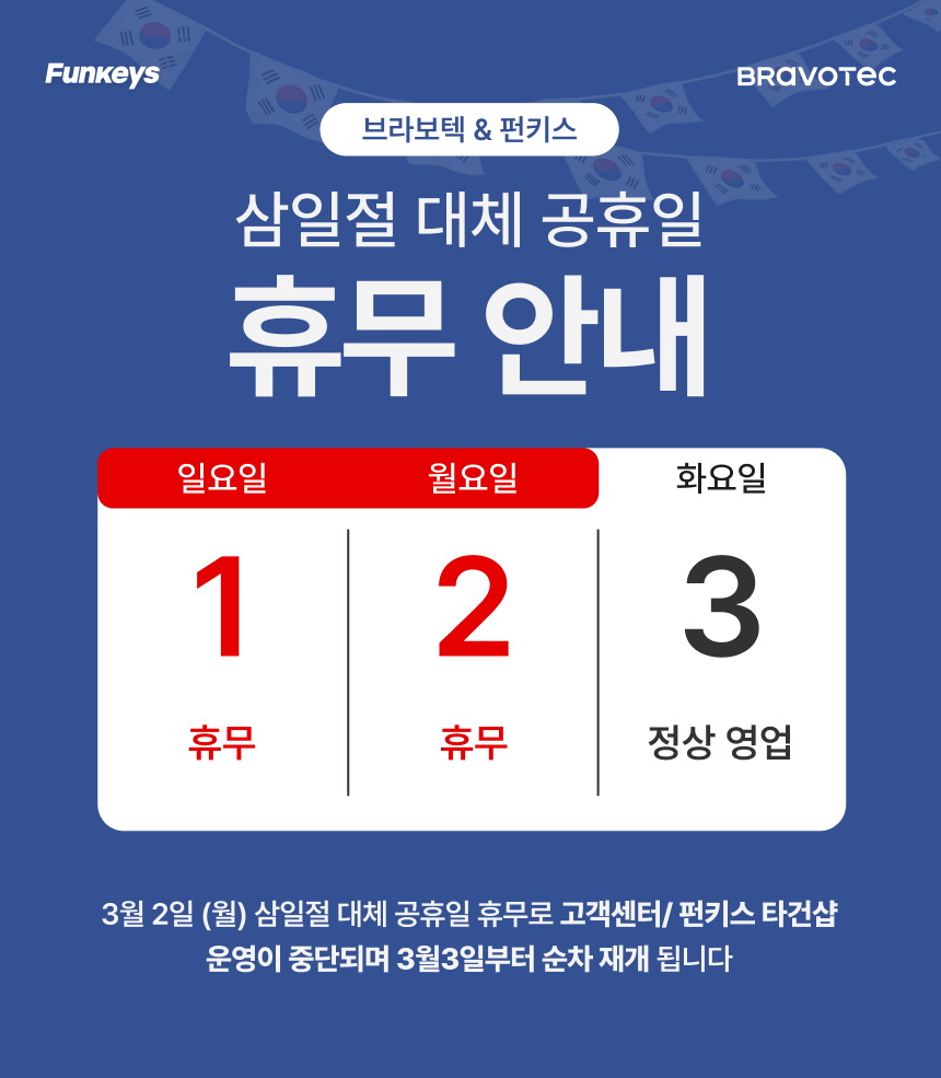 브라보텍 고객지원센터/펀키스 타건샵, 3월 2일(월) 삼일절 대체 공휴일 휴무 안내 브라보텍 공지 0 8 02.26 17:34 안녕하세요. 브라보텍/펀키스입니다.3월 2일(월) 삼일절 대체 공휴일 휴무 안내드립니다.해당일은 택배 발송 및 고객센터 상담 업무, 펀키스 타건샵 운영이 중단되며 다음날부터 순차 재개됩니다.고객센터, 펀키스 타건샵 이용에 참고 부탁드립니다. 감사합니다.