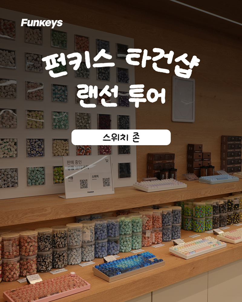이번 카드뉴스에서는 타건샵 스위치 존에서 특히 반응이 좋았던 모델들을 중심으로 키감과 특징을 한눈에 살펴보는 펀키스 타건샵 스위치 존 랜선 투어를 준비했습니다.