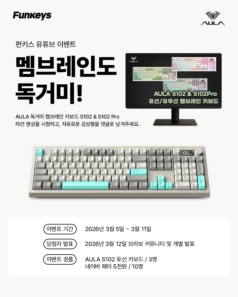 안녕하세요 브라보텍의 프리미엄 키보드/마우스 및 액세서리 브랜드 펀키스 유튜브 채널에서 「AULA 독거미 S102 & S102Pro 유선/유무선 멤브레인 키보드 타건」 영상 댓글 이벤트를 진행합니다.