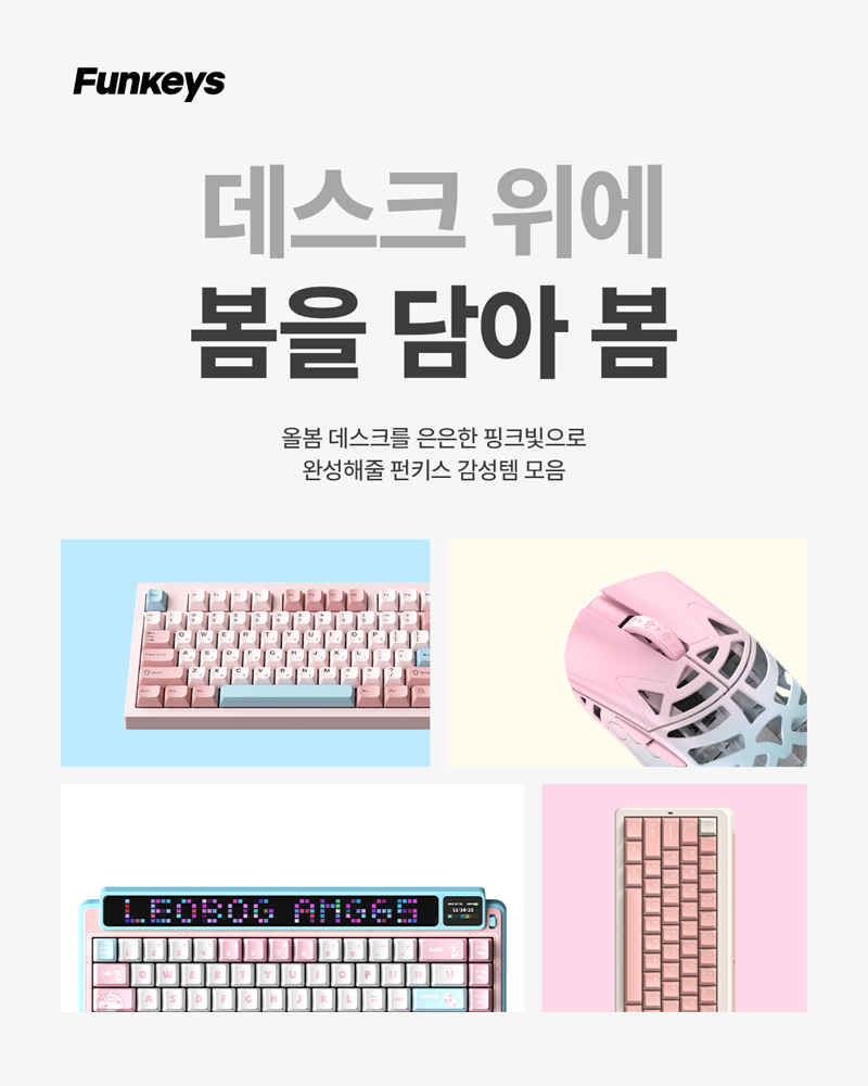 부드러운 파스텔 핑크 컬러가 책상 위 분위기를 화사하게 밝혀주는 키보드로 봄과 잘 어울리는 말랑한 색감이 매력적인 제품입니다.