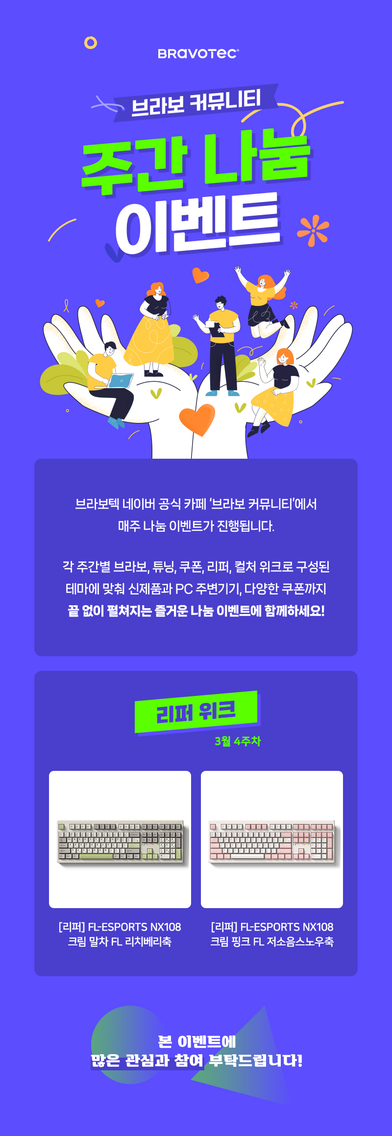 각 주간별 브라보, 튜닝, 쿠폰, 리퍼, 컬쳐 위크로 구성된 테마에 맞춰 신제품과 PC 주변기기, 다양한 쿠폰까지 끝 없이 펼쳐지는 즐거운 나눔 이벤트에 함께하세요!