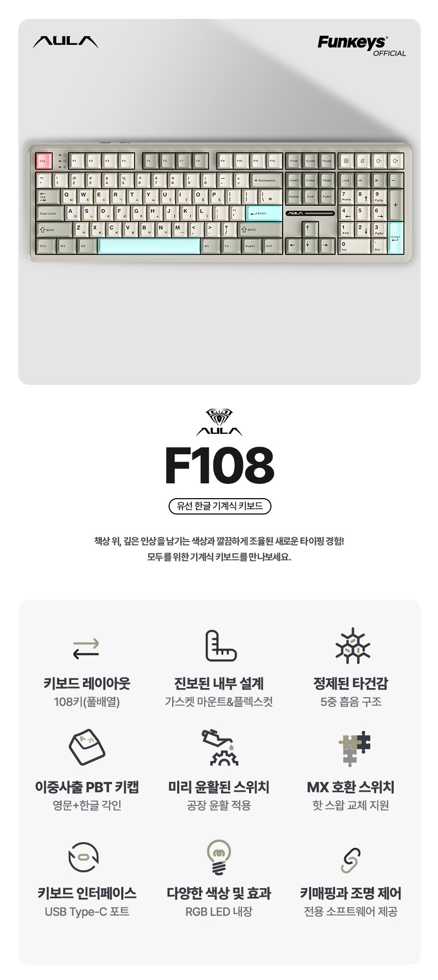 펀키스, 극강의 가성비 풀배열 기계식 키보드 AULA F108 유선 모델 신규 출시 안내