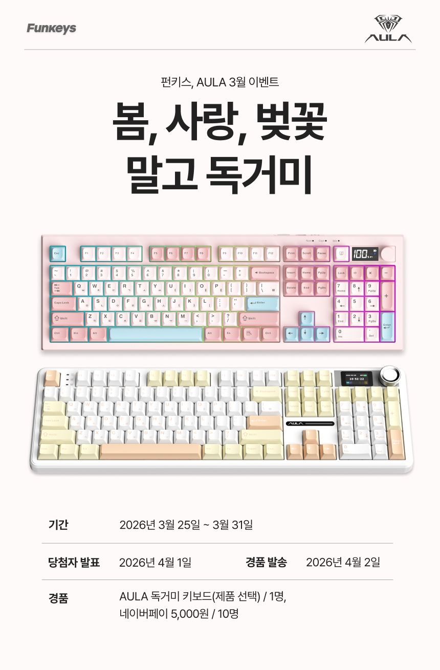 2026년 3월 25일부터 3월 31일까지 펀키스, AULA 3월 이벤트 '봄, 사랑, 벚꽃 말고 독거미’ 가 진행됩니다.
