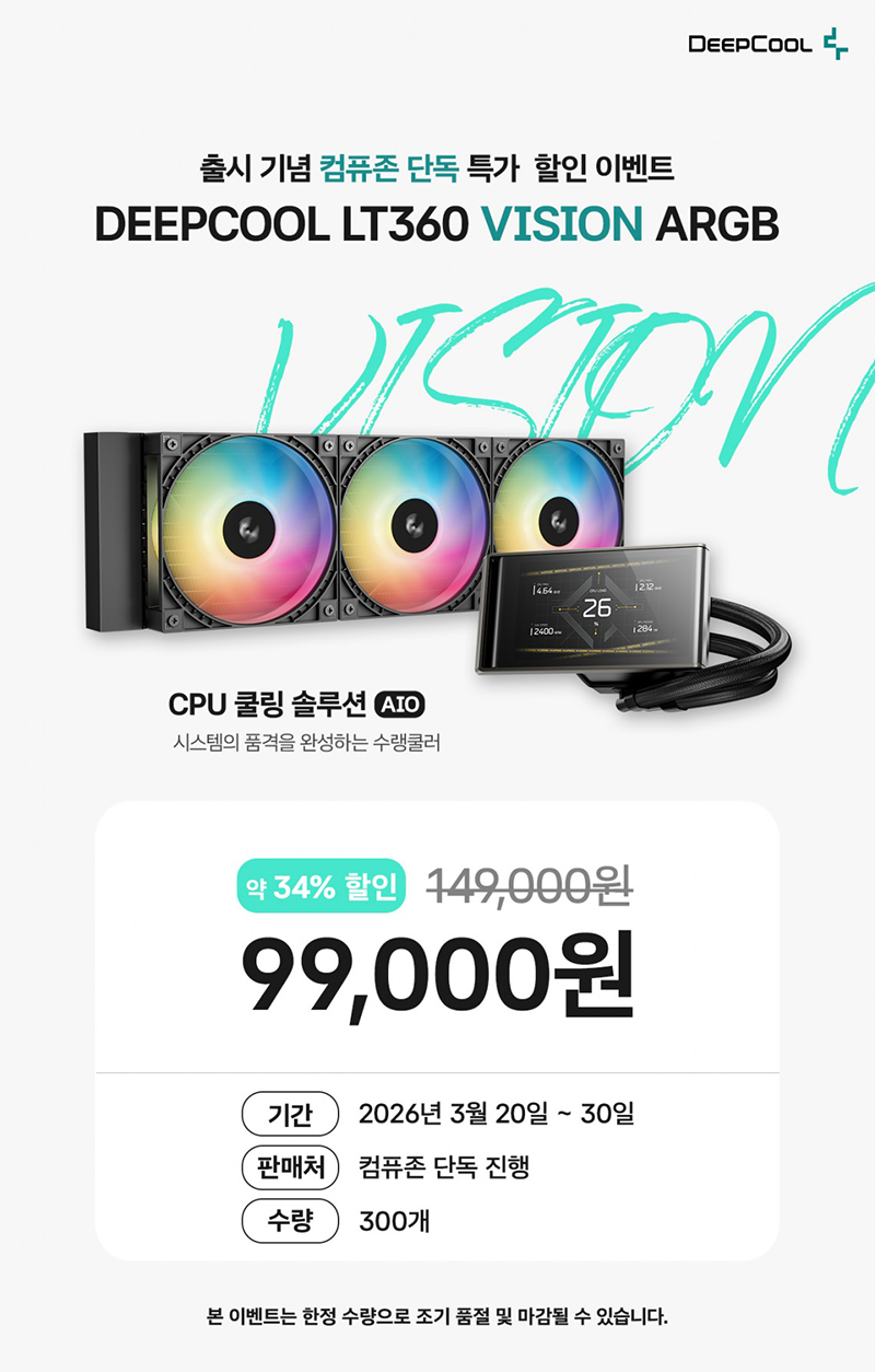 4.5인치 IPS 대형 디스플레이로 시선을 사로잡는 프리미엄 튜닝 감성을 구현한 360mm 일체형 수랭 쿨러, DEEPCOOL LT360 VISION 모델의 출시와 함께 출시 기념 컴퓨존 34% 특가 이벤트 소식 안내