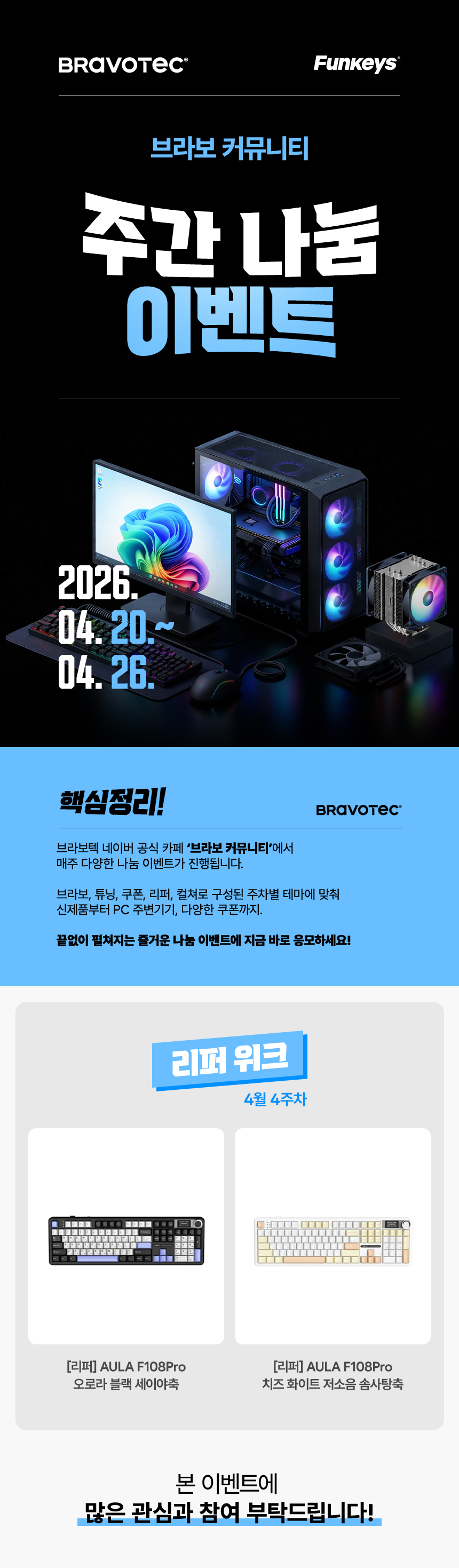 각 주간별 브라보, 튜닝, 쿠폰, 리퍼, 컬쳐 위크로 구성된 테마에 맞춰 신제품과 PC 주변기기, 다양한 쿠폰까지 끝 없이 펼쳐지는 즐거운 나눔 이벤트에 함께하세요!