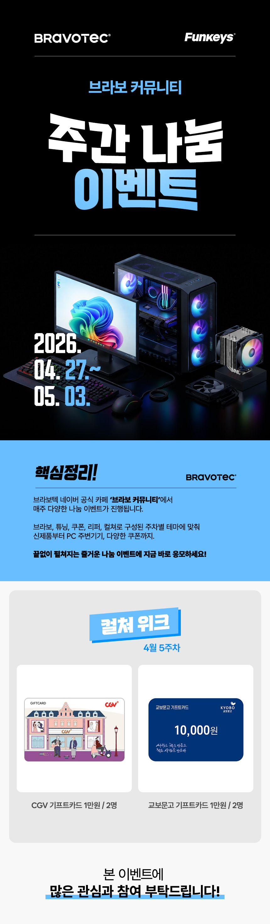 각 주간별 브라보, 튜닝, 쿠폰, 리퍼, 컬쳐 위크로 구성된 테마에 맞춰 신제품과 PC 주변기기, 다양한 쿠폰까지 끝 없이 펼쳐지는 즐거운 나눔 이벤트에 함께하세요!