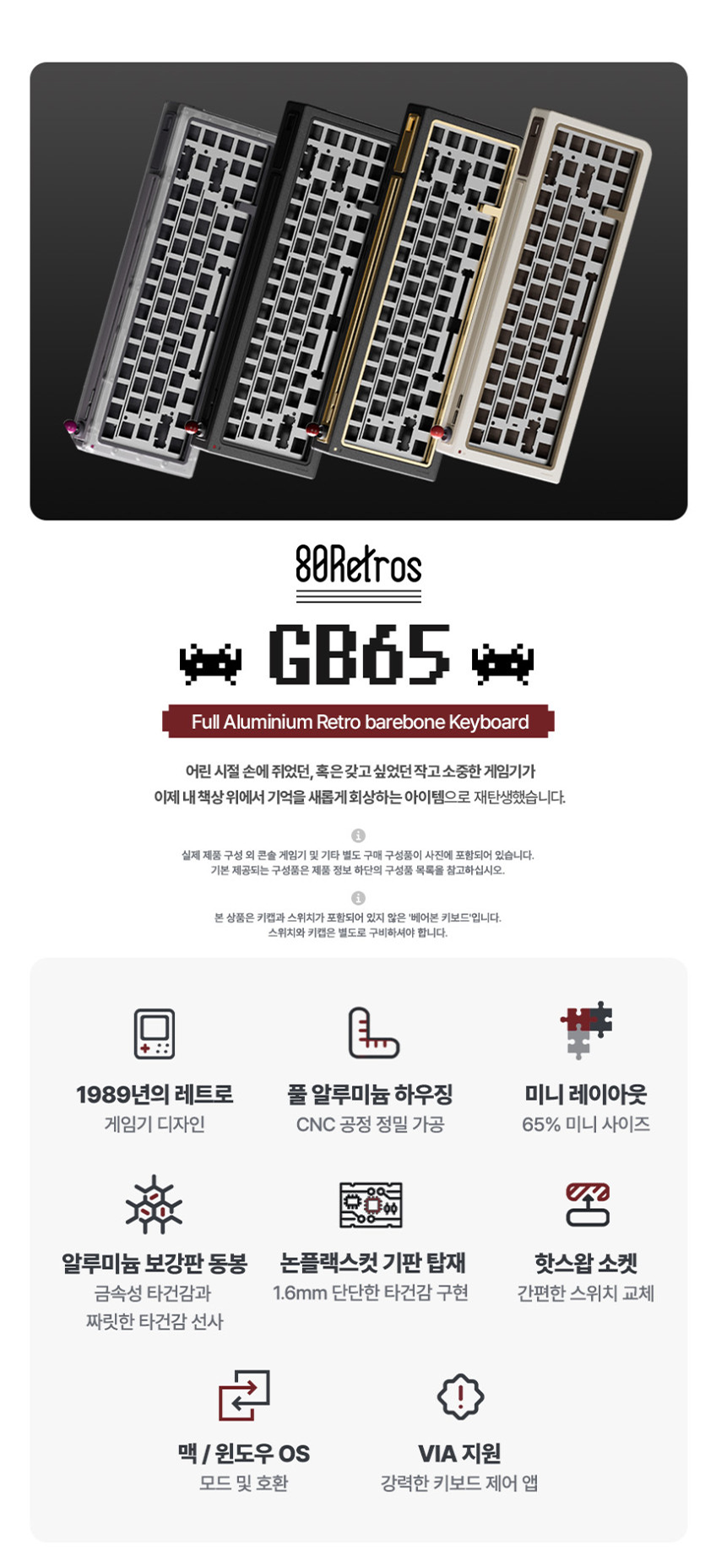 80Retros GB65 베어본 모델은 키캡과 스위치가 제외된 베어본 킷으로, 사용자가 핵심 구성 요소를 직접 선택할 수 있어 보다 합리적인 구성과 높은 자유도의 커스터마이징이 가능한 것이 특징입니다.
