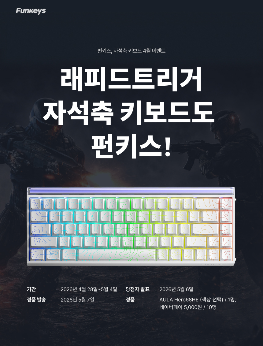 2026년 4월 28일부터 5월 4일까지 펀키스, 자석축 키보드 4월 이벤트 '래피드트리거 자석축 키보드도 펀키스!’ 가 진행됩니다.