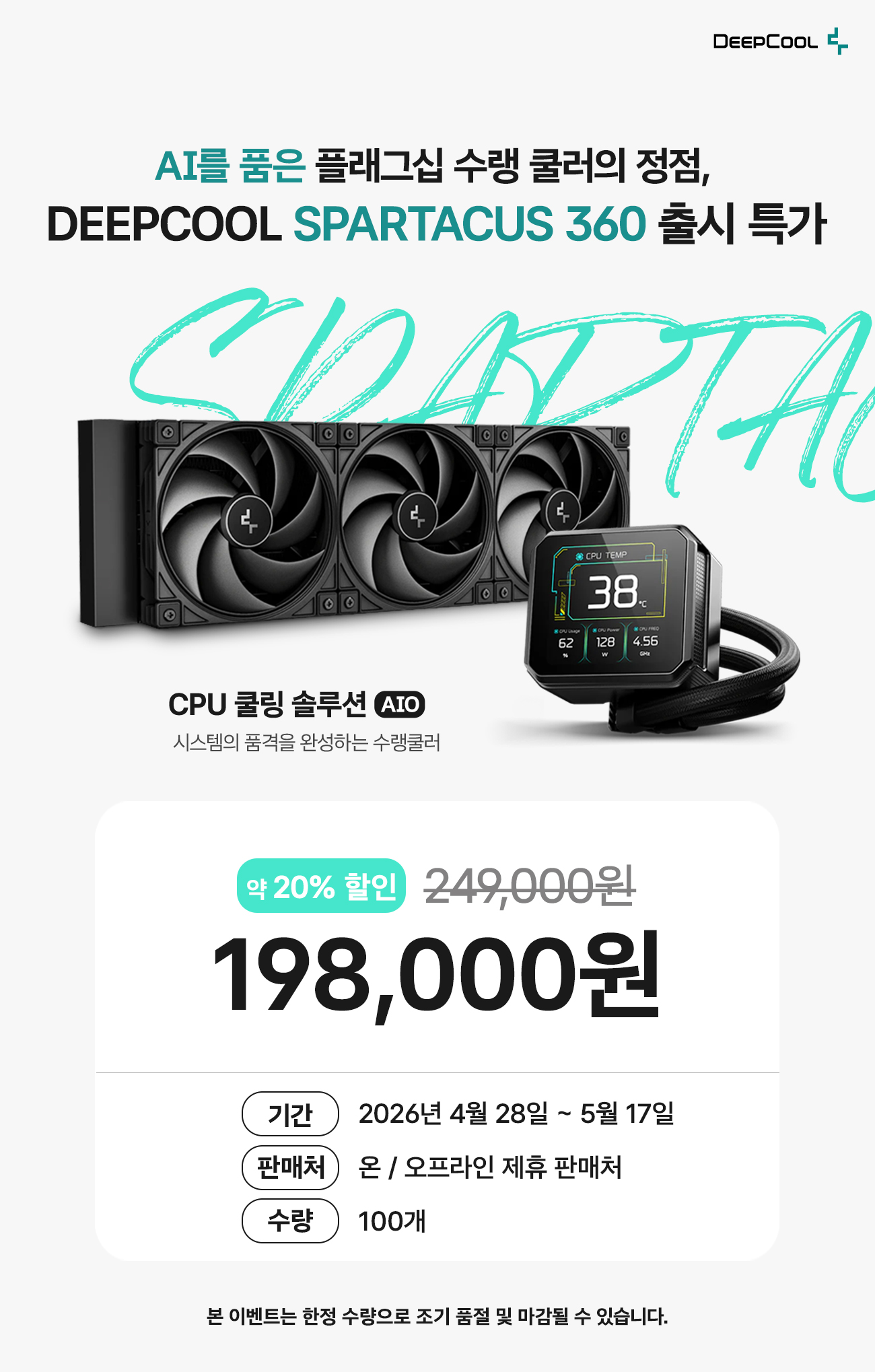 출시 특가 이벤트는 온·오프라인 제휴업체를 통해 4월 28일부터 5월 17일까지 진행되며, DEEPCOOL SPARTACUS 360 모델 정상가 249,000원에서 약 20% 할인된 198,000원에 100개 한정 수량으로 판매 진행되며, 특가 이벤트는 한정 수량으로 조기 품절 및 마감될 수 있습니다.