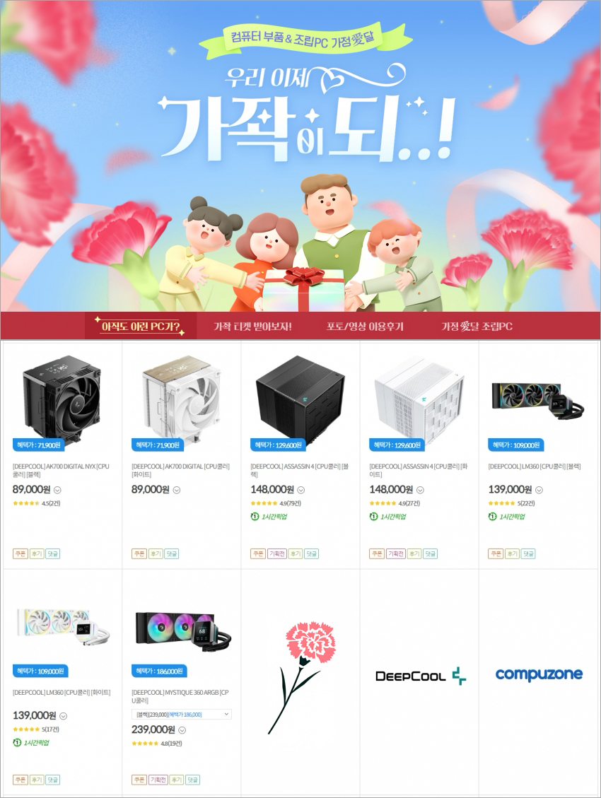 이번 프로모션은 컴퓨존의 ‘컴퓨터 부품 & 조립PC 가정애(愛) 달’ 기획전을 통해 진행되며, DEEPCOOL의 인기 공랭 및 수랭 쿨러 제품들을 할인된 가격으로 만나보실 수 있습니다.