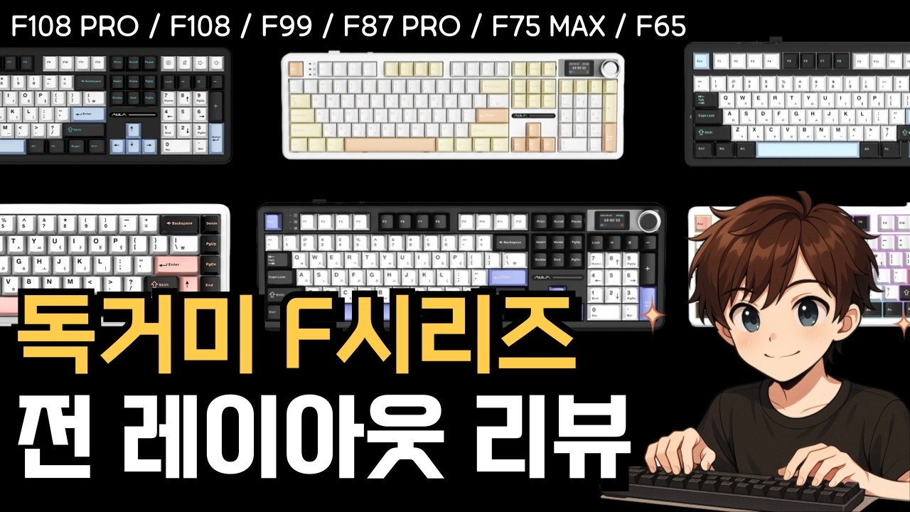 미니 배열 F65부터 LCD와 노브를 탑재한 풀배열 F108 Pro까지, 총 6종의 다양한 배열을 자랑하는 AULA 독거미 F 시리즈!